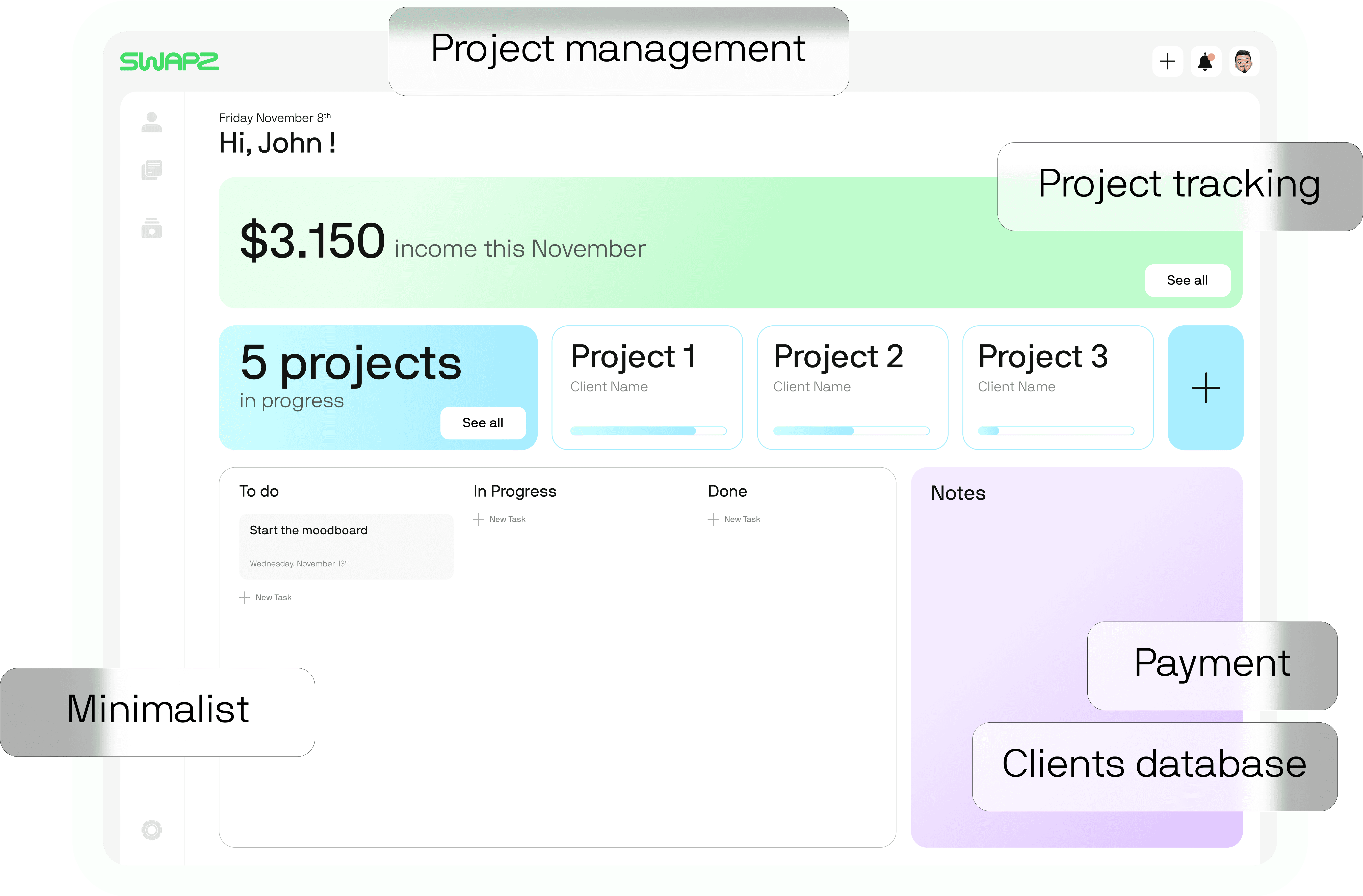 Swapz streamlines the payment and management process for freelancers by managing projects, contracts, clients, and payments, while offering real-time project tracking shared with their clients.